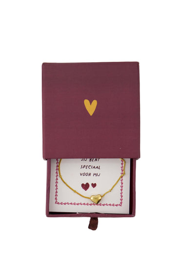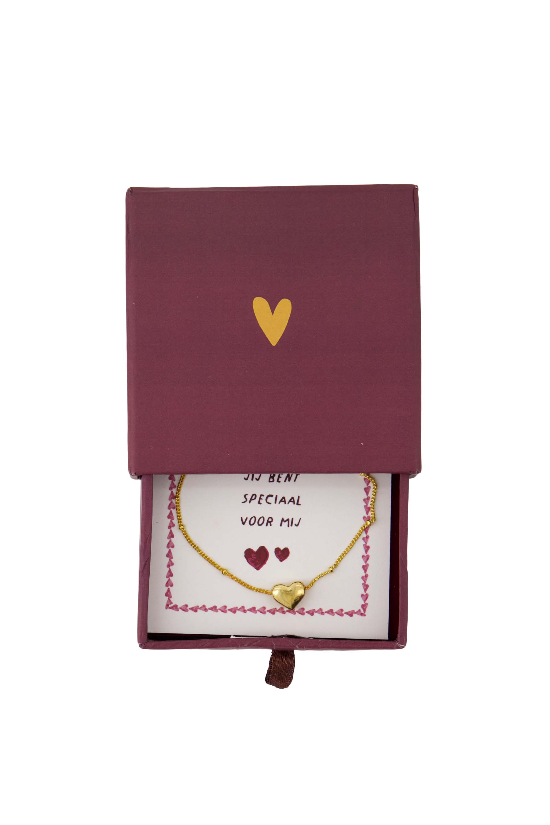 Dieses Zusss-Armband mit Herz ist ein subtiles Geschenk mit viel Bedeutung. Das zarte Goldarmband ist in einer coolen roten Schiebeschachtel verpackt, perfekt um jemanden damit zu überraschen. Das goldene Herz macht dieses Armband zu etwas ganz Besonderem und ist ein sanfter Akzent für jeden Look. Der luxuriöse Look und die besondere Schachtel sorgen für eine warme Präsentation. Mit diesem Zusss-Armband mit Herz verschenkst du ein einfaches, aber einzigartiges Schmuckstück, das mit Stil getragen werden kann.