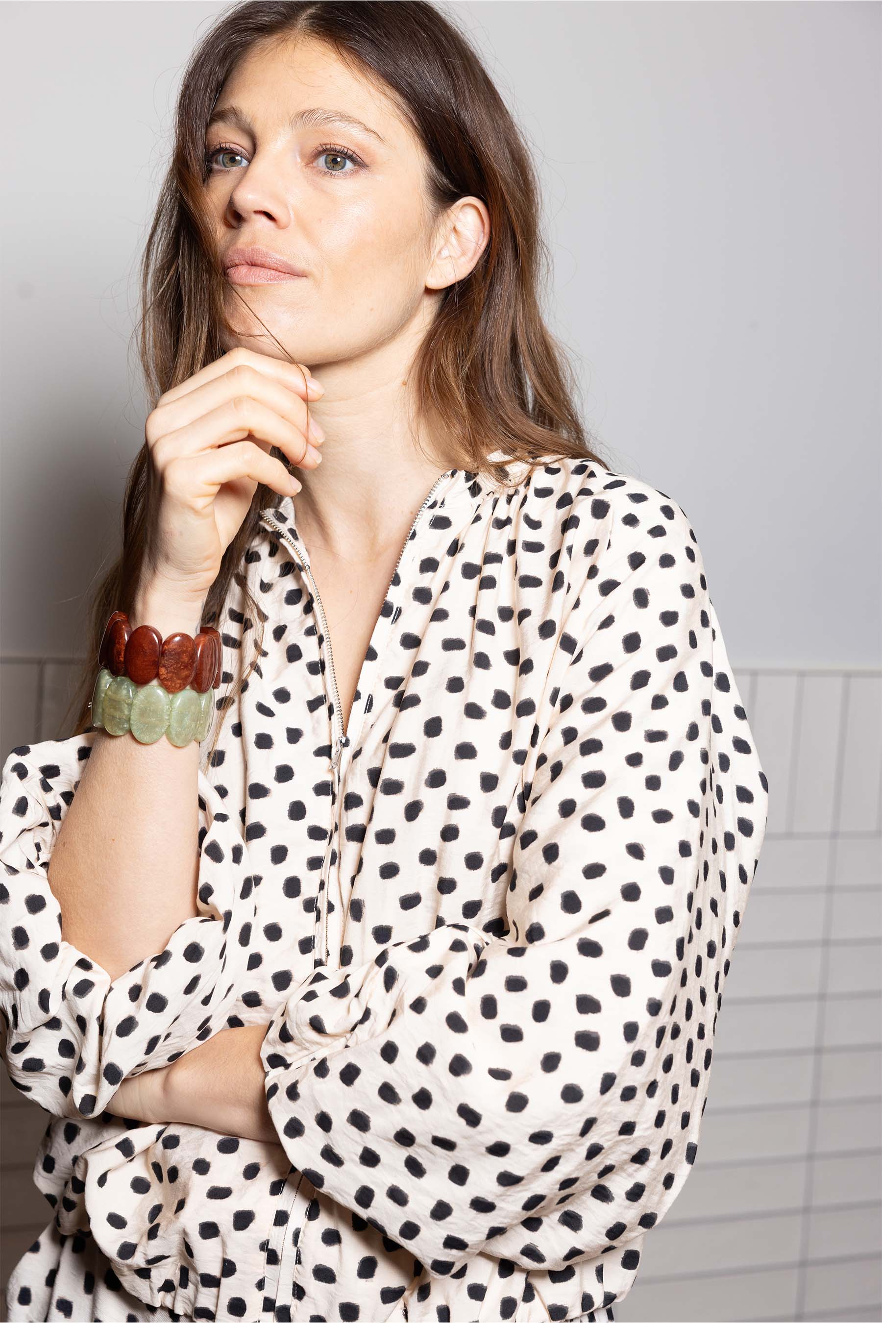 De Zusss armband kralen elastiek is een stijlvolle accessoire die je outfit compleet maakt. Deze armband kralen elastiek bestaat uit grote ovale stenen, met een zachte olive green kleur die natuurlijkheid uitstraalt. Dankzij het elastiek past de armband comfortabel om je pols, zonder gedoe met sluitingen. Combineer deze armband met andere sieraden voor een speelse en unieke uitstraling. De Zusss armband kralen elastiek brengt een subtiel tintje kleur en elegantie in je dagelijkse stijl.