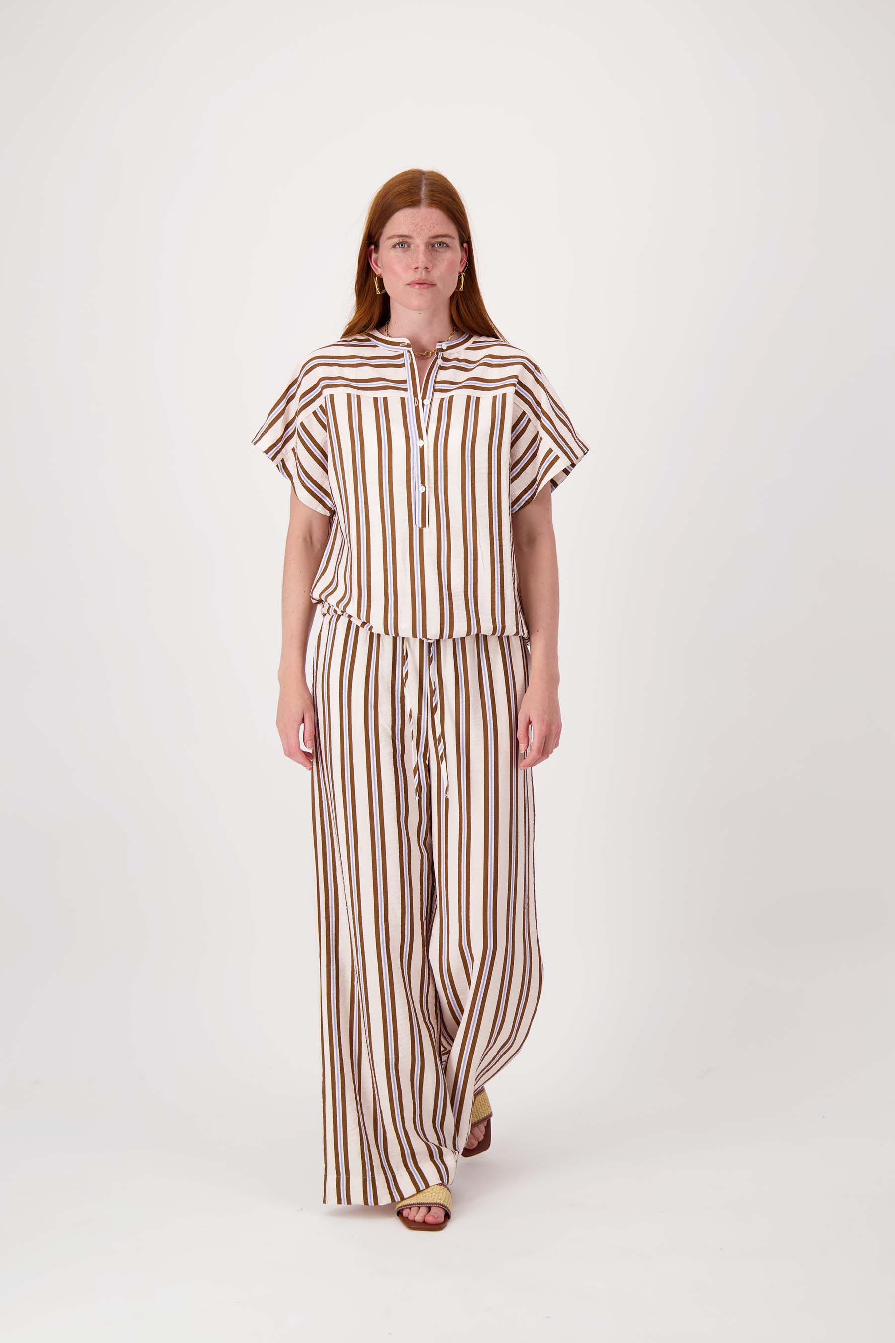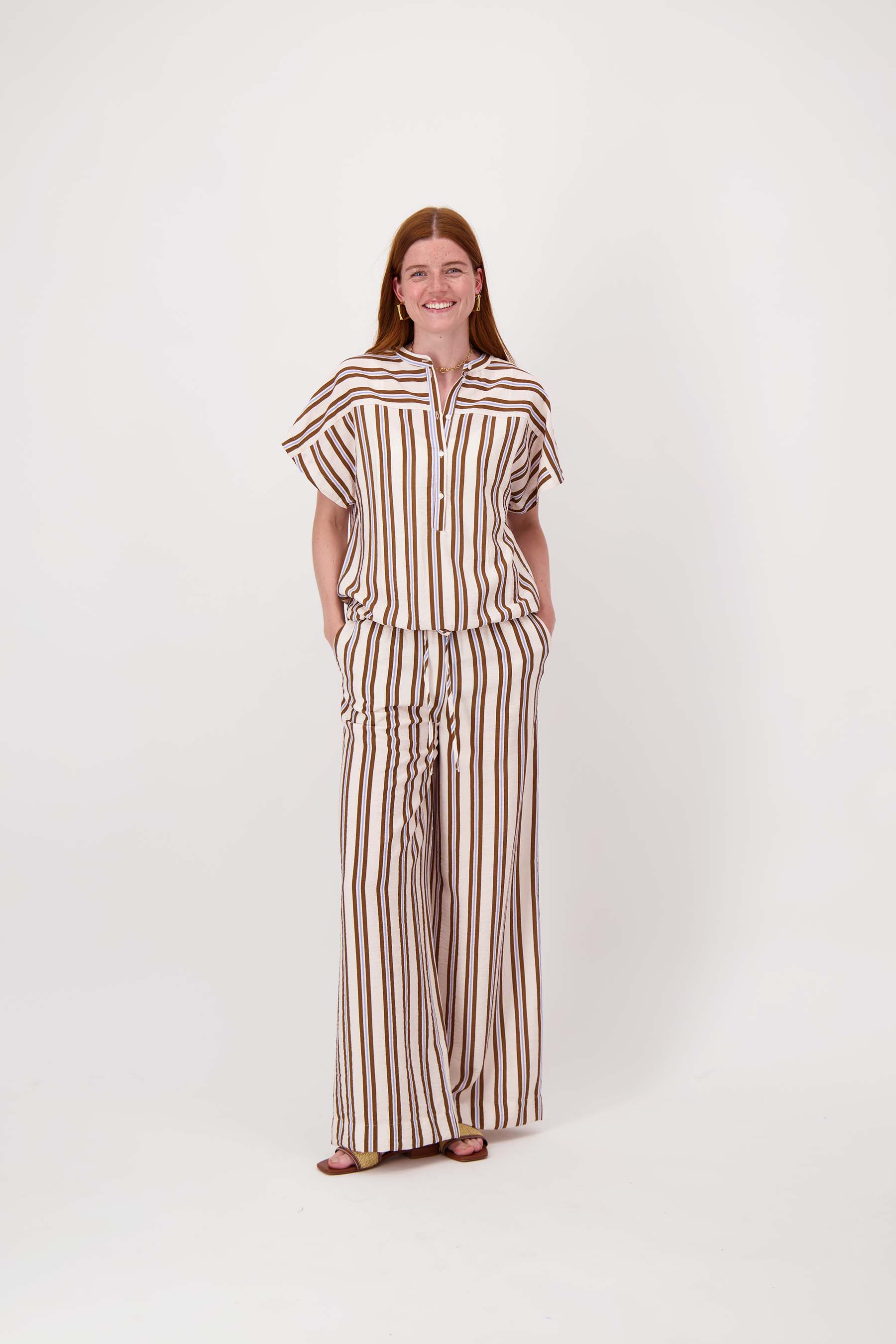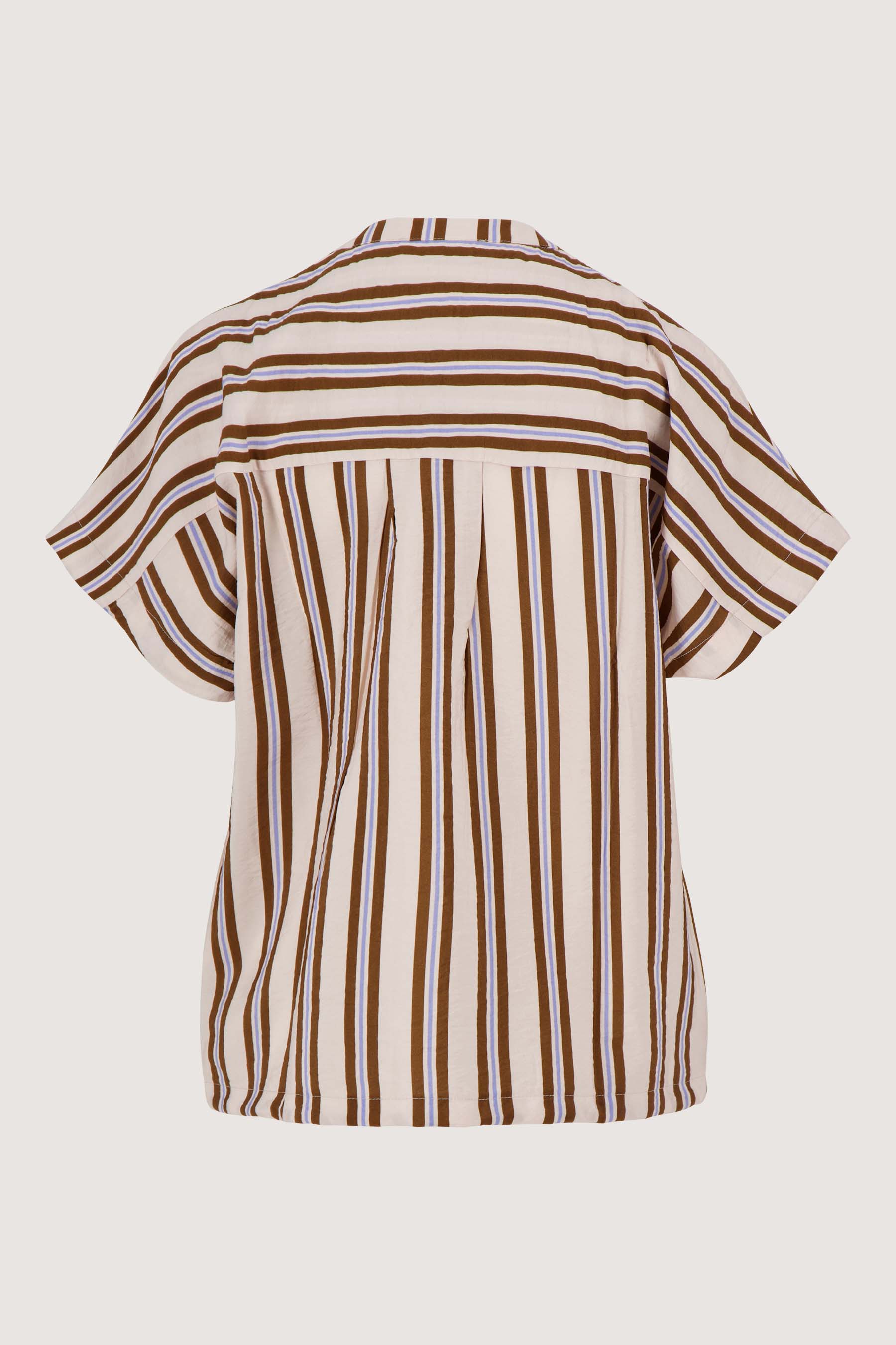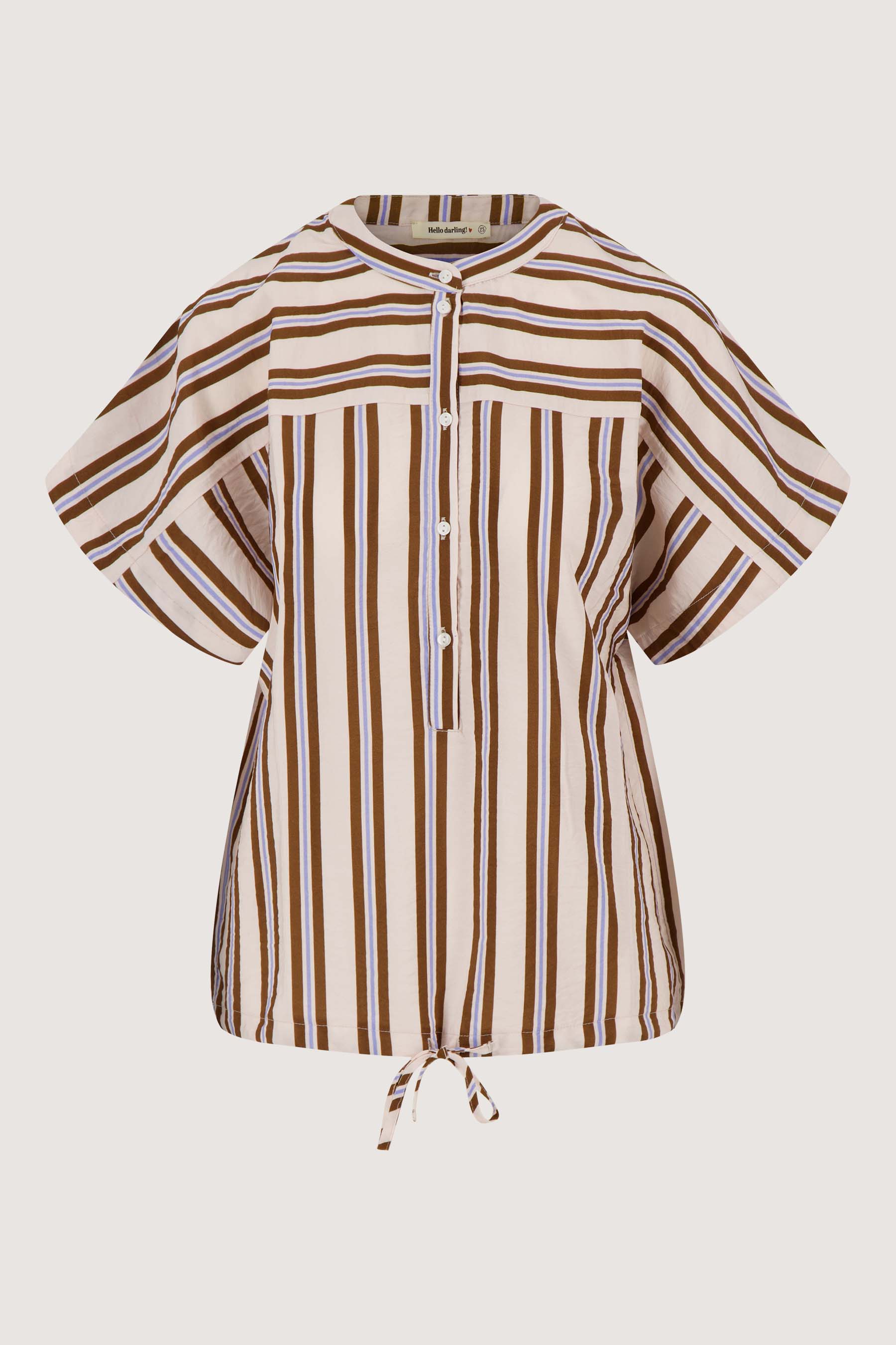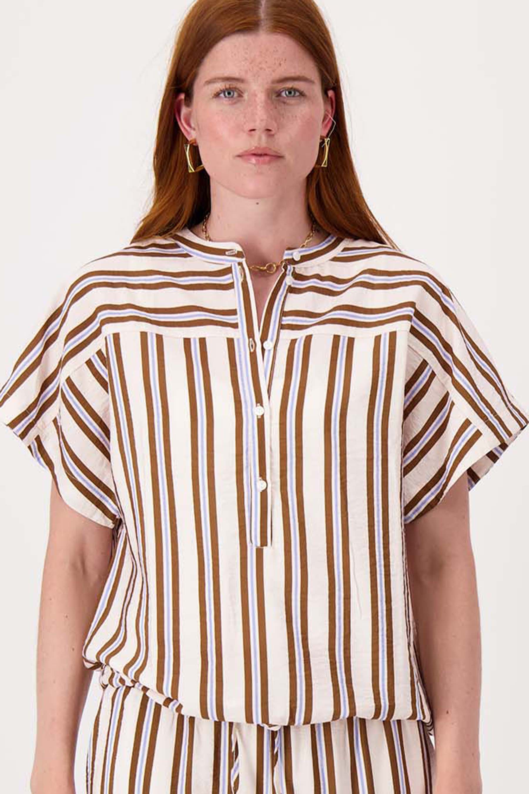 Die gestreifte Kurzarmbluse von Zusss ist perfekt für einen lässigen und stilvollen Look. Diese Bluse hat einen frischen Off-White-Grundton mit Streifen in Schokoladenbraun und Kornblumenblau, was für einen verspielten Effekt sorgt. Die Bluse wird mit einer feinen Knopfleiste geschlossen und hat kurze, weite Ärmel für zusätzlichen Tragekomfort. Die gestreifte Bluse mit kurzen Ärmeln belebt jedes Outfit und ist ideal für warme Tage oder zum Kombinieren mit anderen Kleidungsstücken. Kombinieren Sie die Bluse mit einer unserer Hosen, um das Outfit zu vervollständigen.