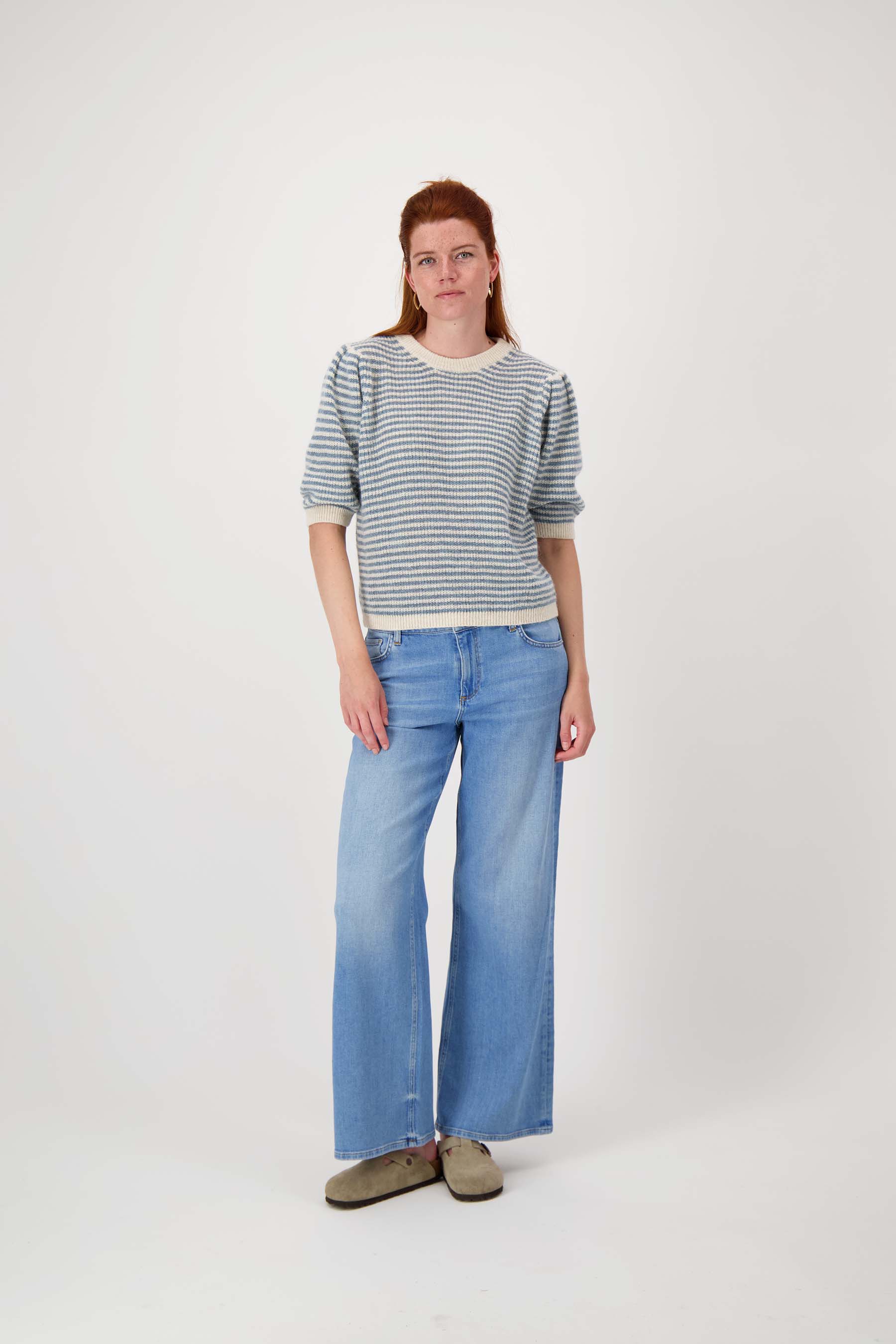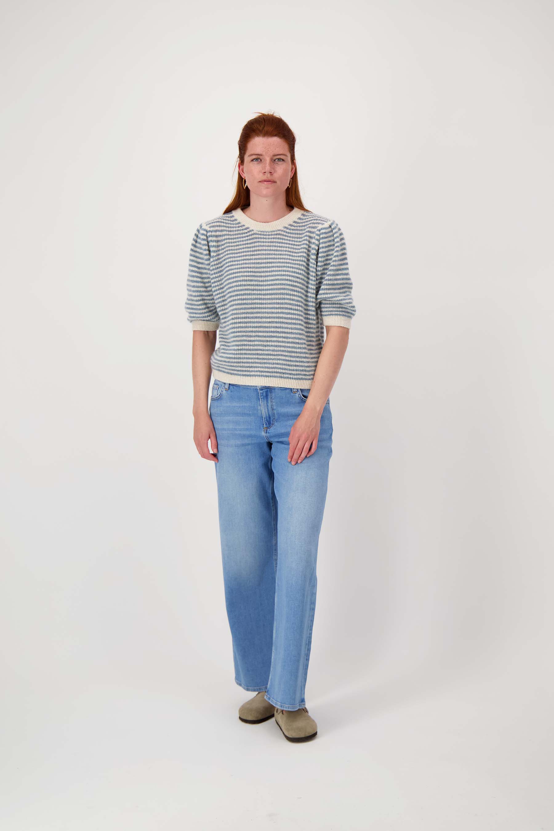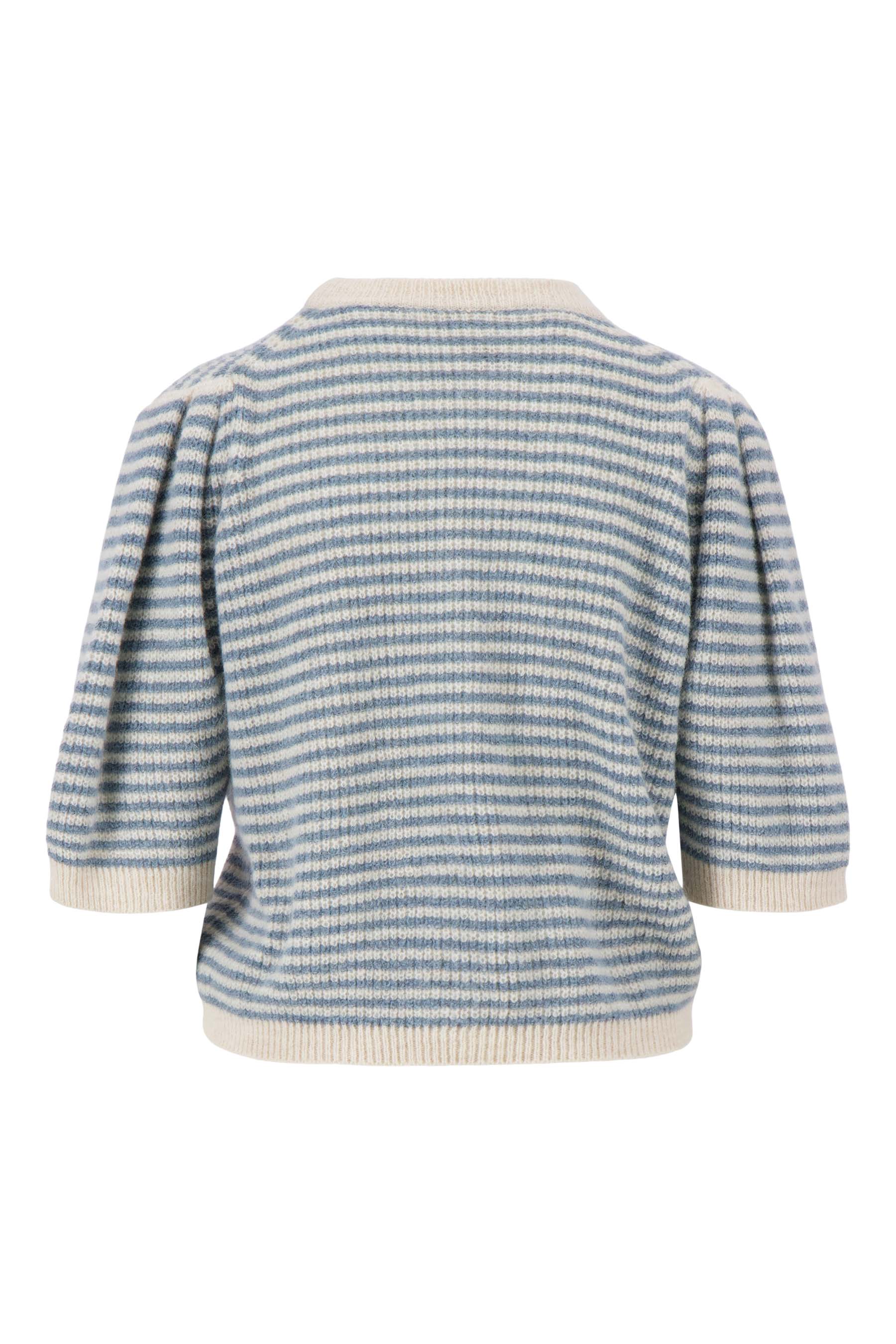 De Zusss gestreepte trui met contrast ribs is een frisse musthave in je garderobe. Deze trui valt op door de subtiele strepen in sky blue en off white en de contrasterende ribboorden bij de hals, mouwen en zoom. De korte pofmouwtjes geven de trui een speels en vrouwelijk detail. Combineer deze gestreepte trui met jeans voor een heerlijk comfortabele en stijlvolle look.