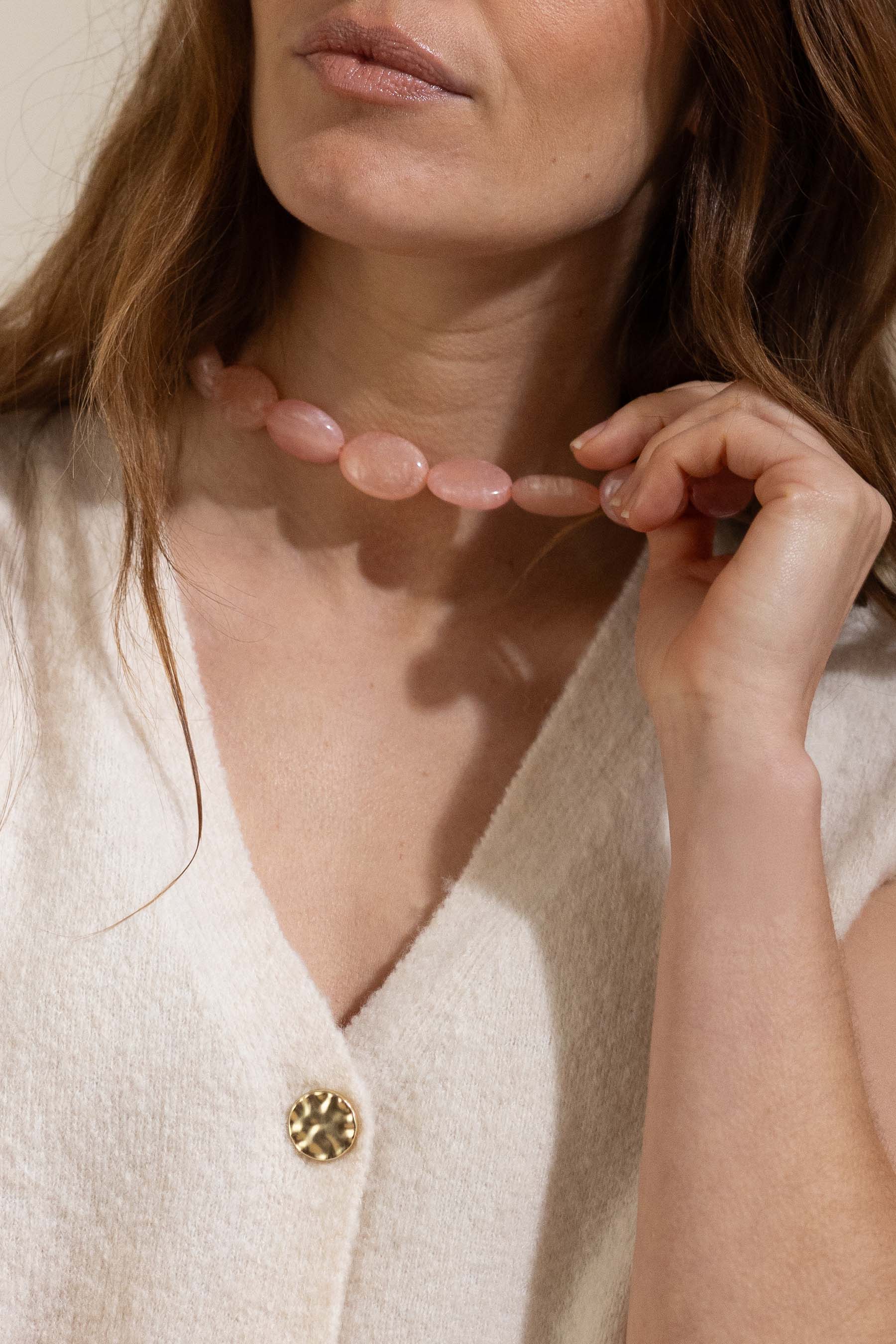 De Zusss ketting van platte kralen is dé eyecatcher die je outfit nét dat beetje extra geeft. Deze ketting van platte kralen charmeert met zijn unieke, ovale kralen in een zachte crispy pink kleur. Met de goudkleurige sluiting en verstelbare lengte draag je ‘m precies zoals jij wilt. Perfect om jouw stijl compleet te maken met een subtiele doch opvallende touch. Combineer de ketting met een leuk vest om de look af te maken.