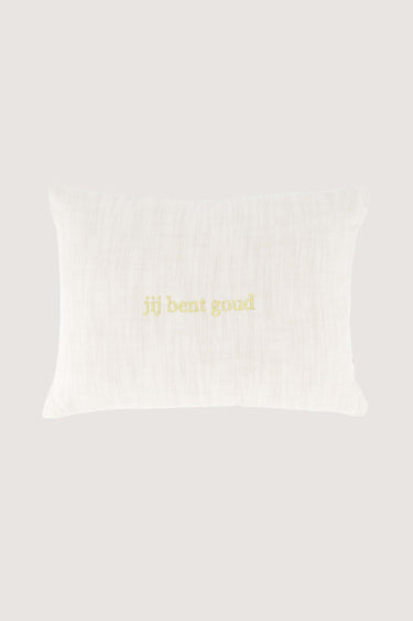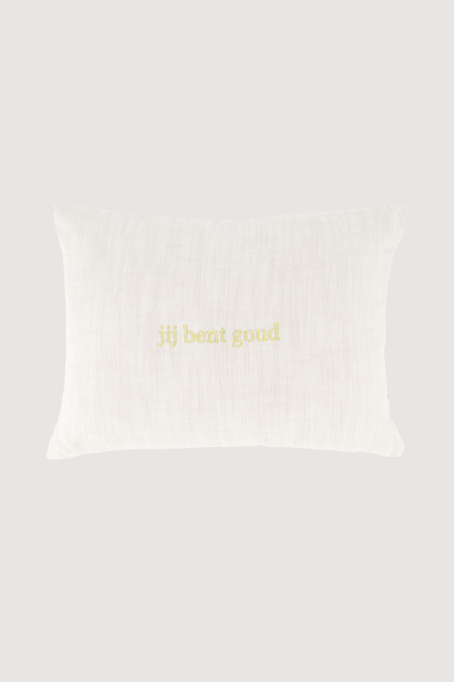 Dit Zusss sierkussen zorgt voor warmte in je interieur. Het kussen met de tekst "jij bent goud" is gemaakt van zachte stof in een peper en zout kleur met gouden letters. Met een afmeting van 35x25 cm past dit Zusss sierkussen perfect op je bank of stoel. Het hoogwaardige materiaal geeft comfort en duurzaamheid. Voeg dit mooie Zusss sierkussen toe aan je huis voor een speelse, luxe touch. Combineer dit sierkussen met een van onze sieraden om weg te geven aan cadeautje.