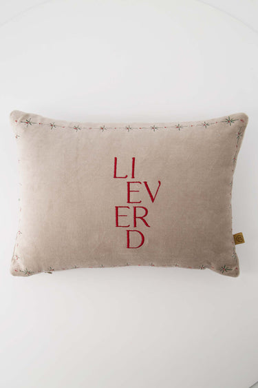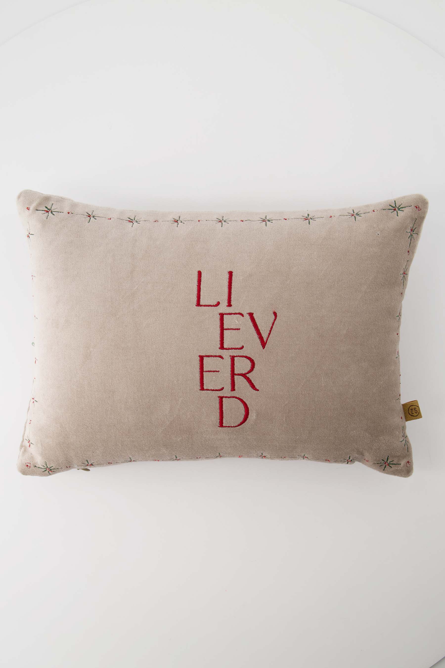 Dit Zusss kussen lieverd is een fijne toevoeging aan je interieur. Het zandkleurige kussen heeft een zachte, velvet uitstraling met subtiele borduursels langs de randen en het woord ‘lieverd’ in opvallend rood. Met zijn afmeting van 35x25 cm past het perfect op de bank of een fijne stoel. Het Zusss kussen lieverd in zand brengt warmte en persoonlijkheid zonder poespas in je woonkamer.