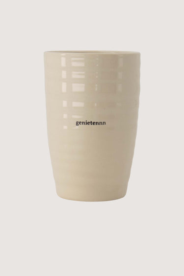 Zusss-Becher mit Aufschrift „genietennn” in Sandfarbe
