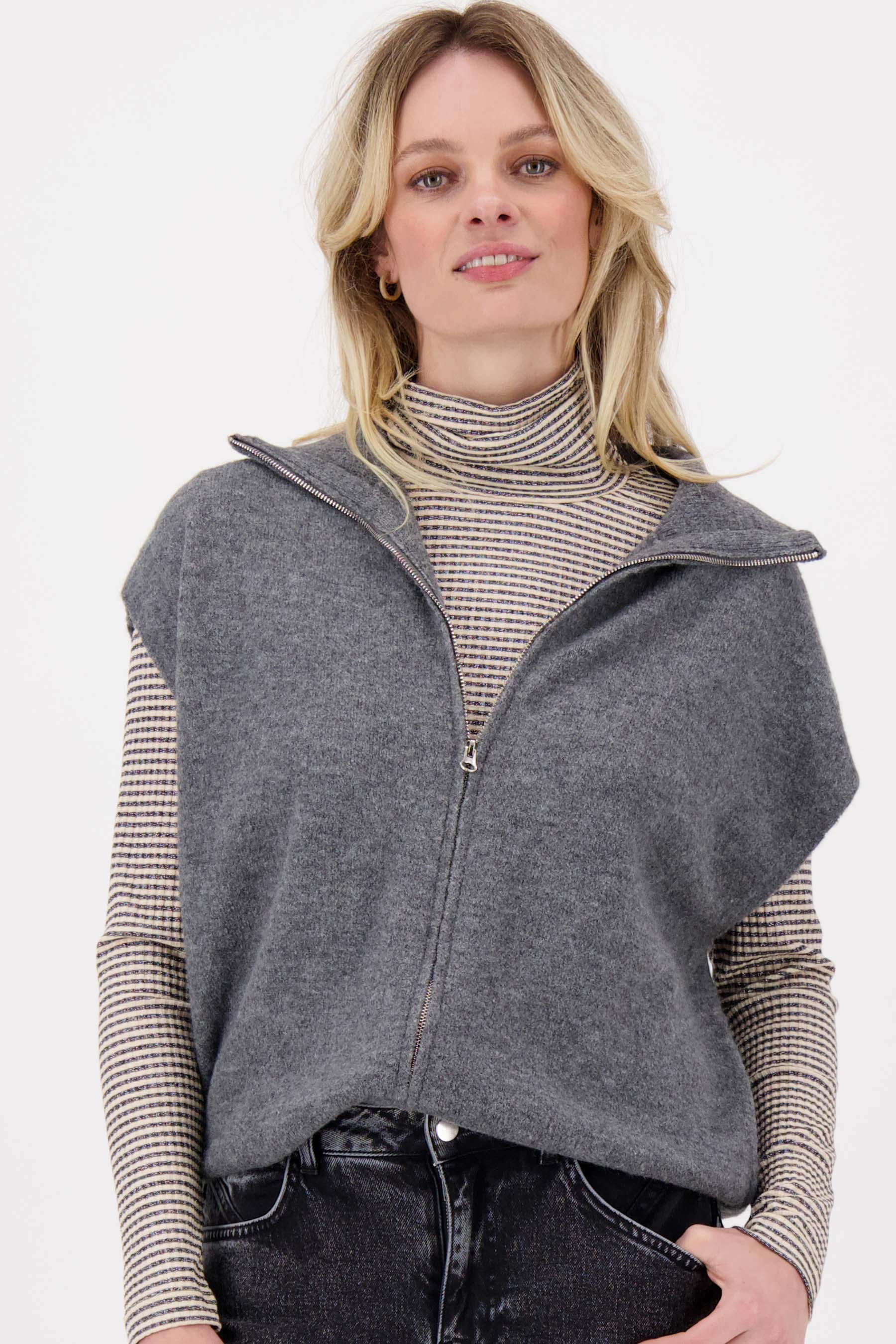 Dit mouwloos vestje met rits van Zusss is een fijne toevoeging aan je garderobe. Het vestje, uitgevoerd in antracietgrijs, combineert comfort en een stoere look... Lees meer