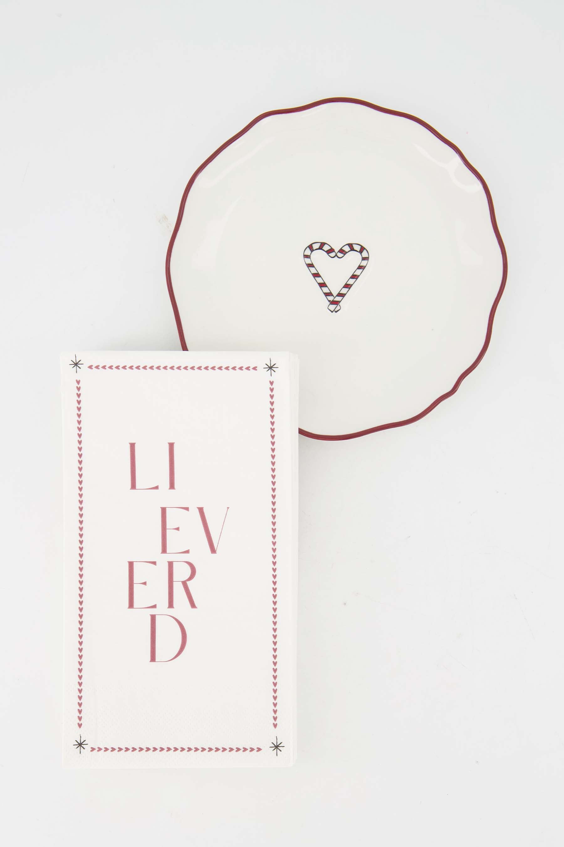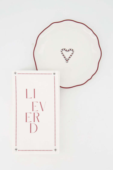 De Zusss serveerset brengt warmte aan tafel met wit en donkerrood. Deze serveerset is perfect voor het serveren van lekkernijen en maakt elk samenzijn nog gezelliger. Het witte bord heeft een speelse, golvende rand in donkerrood en een hartje als subtiel detail in het midden. De bijpassende servetten in wit met donkerrode letters maken de set helemaal af. Deze serveerset voegt een tikkeltje eigenzinnigheid toe aan jouw tafeldecoratie en past prachtig bij de Zusss stijl.