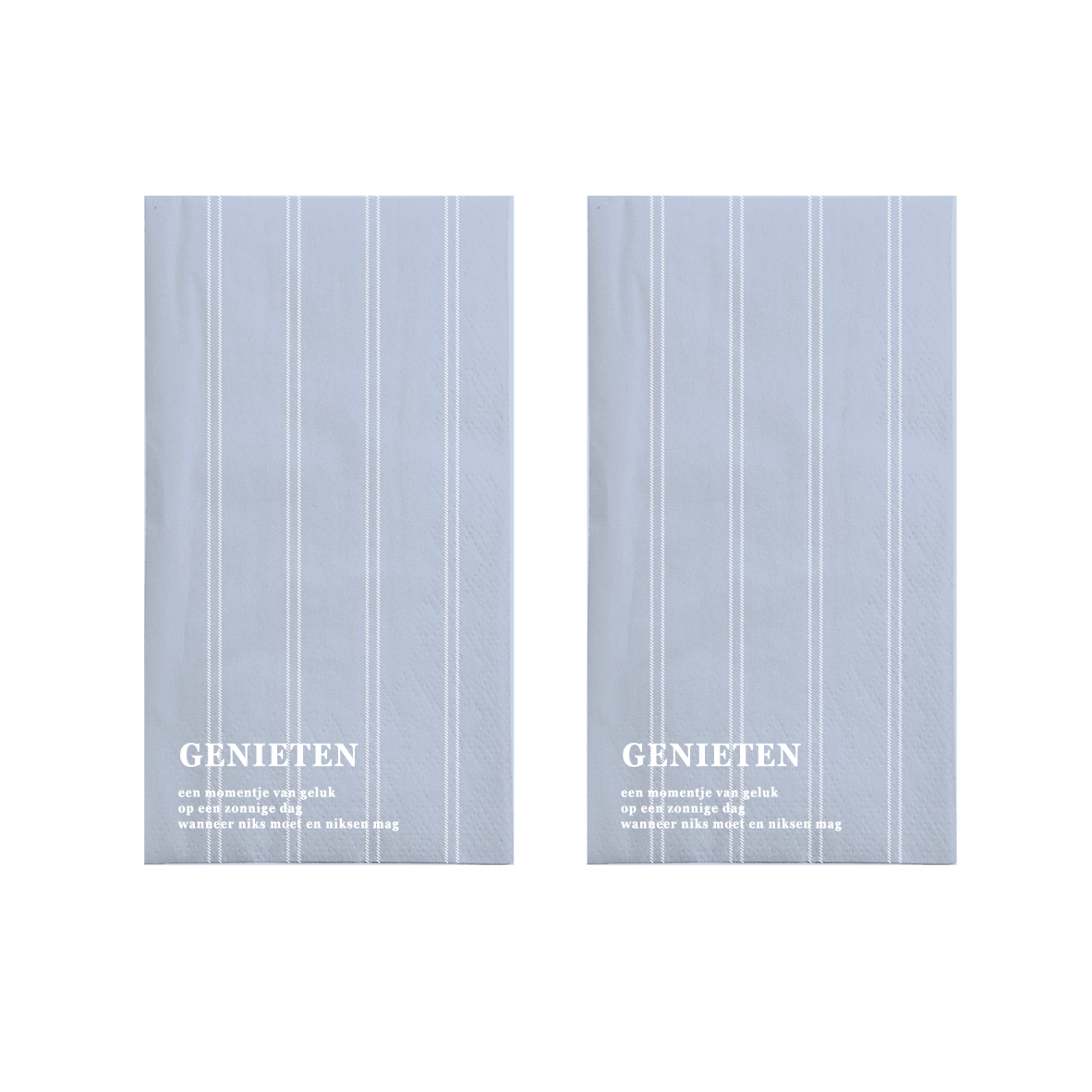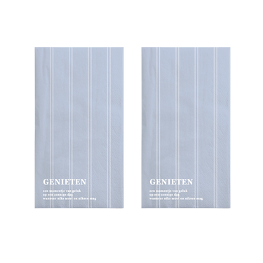 De Zusss servetten zijn niet zomaar servetten, maar een fijne toevoeging aan je tafeldecoratie. Deze servetten combineren praktisch gebruik met een rustige, blauwe kleur en een subtiel streeppatroon. De tekst ‘Genieten’ op de servetten benadrukt dat het bij deze servetten draait om ontspannen en samen zijn. Ideaal voor een zonnige brunch of een knus diner. De rechthoekige vorm maakt ze veelzijdig inzetbaar en geeft elke tafel een gezellige, persoonlijke touch.
