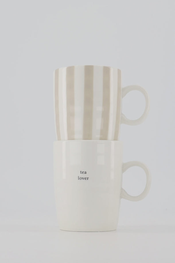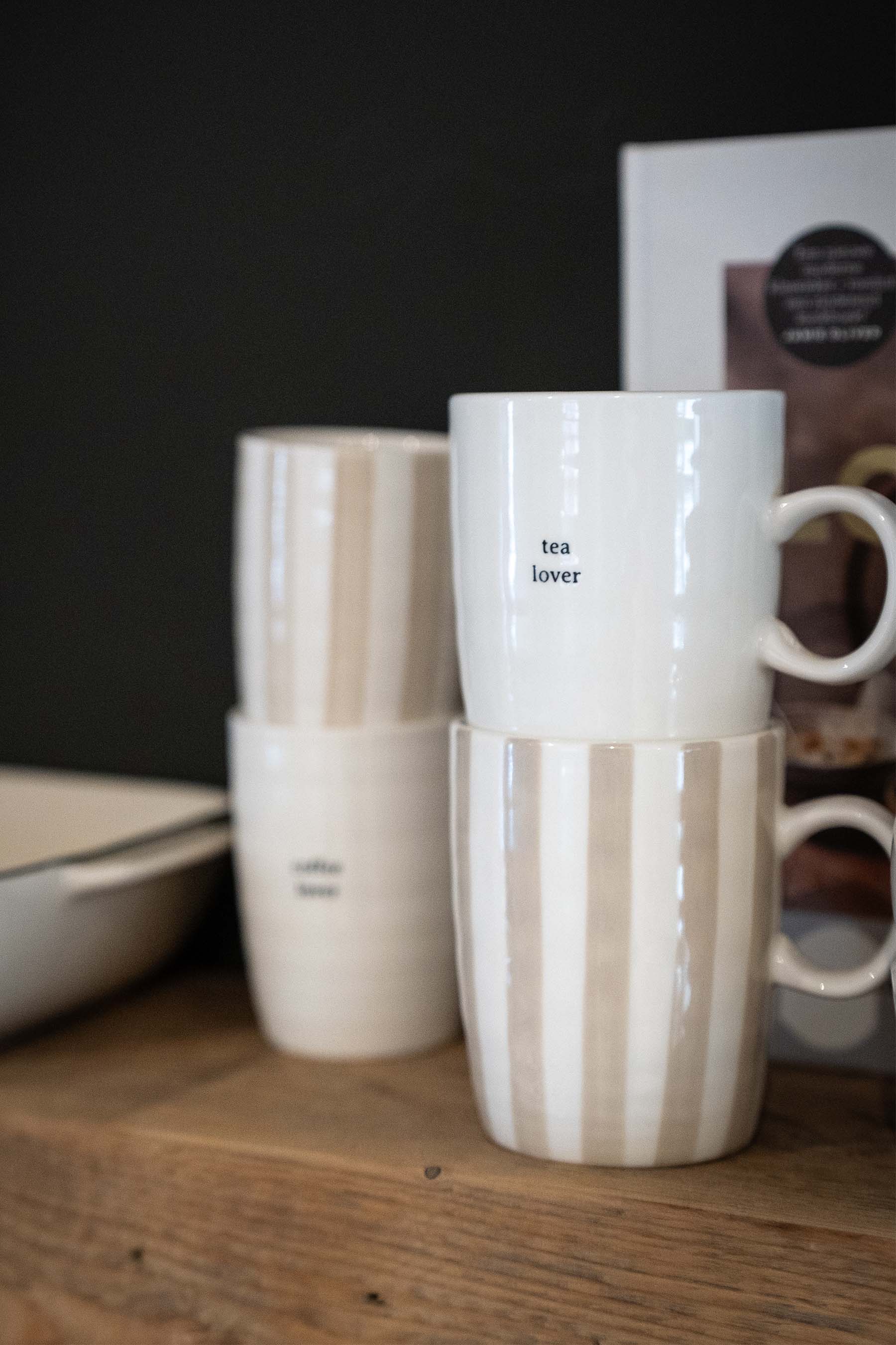 Deze Zusss theemokken set is perfect voor iedere theeliefhebber die warme momenten wil koesteren. De theemokken set is gemaakt van hoogwaardig keramiek en heeft een rustige, zandkleurige streep en een witte mok met de tekst "tea lover" in zwart. De afmetingen van de mokken zorgen ervoor dat je kunt genieten van een heerlijke kop thee. Met deze theemokken set voeg je stijl en comfort toe aan je servies. Ontdek ook onze servies collectie voor meer unieke Zusss items.
