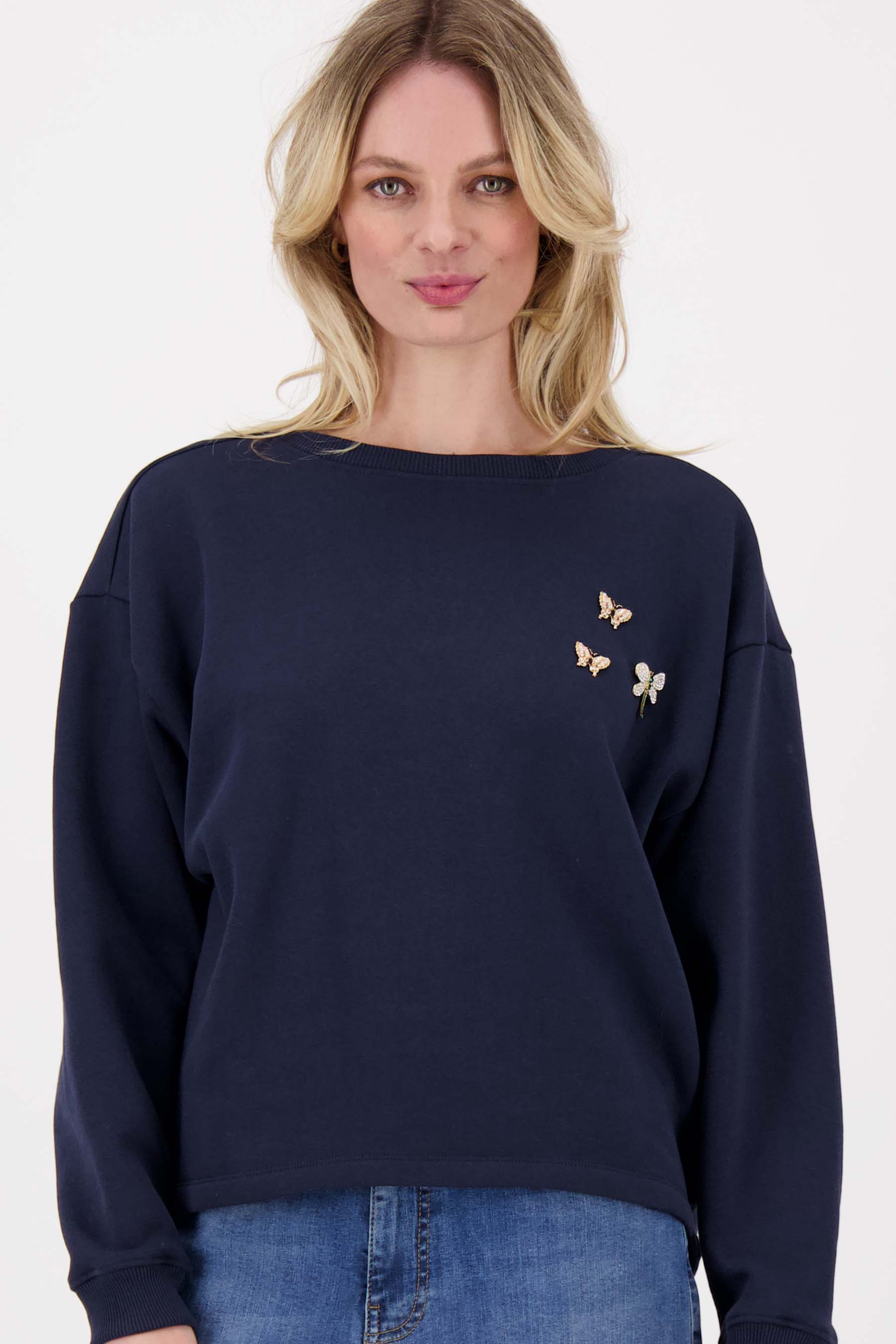Deze zusss sweater met broche in navy is een fijne toevoeging aan je garderobe. De zachte stof voelt comfortabel aan en de kleine, glinsterende broche aan de voorkant geeft het een speels en uniek detail. Perfect om casual te dragen, maar je outfit nét even anders te maken. De sweater heeft een relaxte pasvorm en lange mouwen, ideaal om in te ontspannen. Combineer deze zusss sweater met broche makkelijk met andere basics uit onze collectie.
