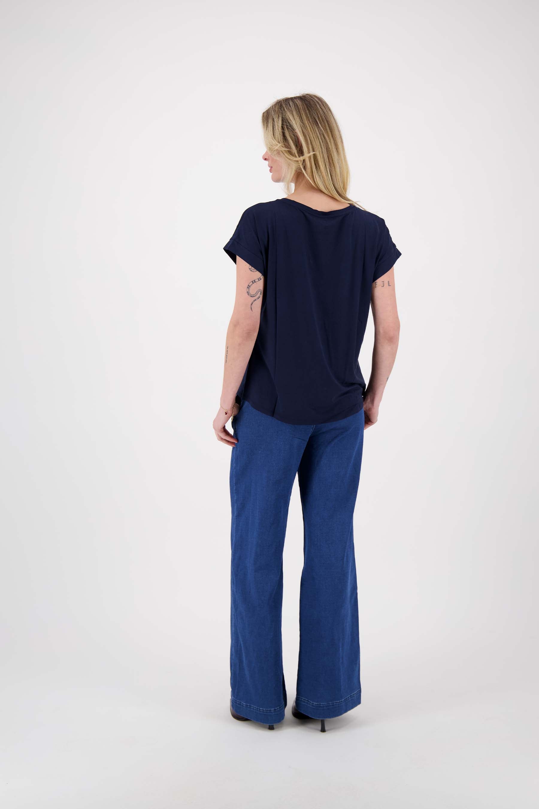 Feines, einfaches Zusss-T-Shirt in der Farbe dunkelblau. Dieses Oberteil ist ein ideales Basic, man kann es mit so vielen Sachen kombinieren! Das Oberteil hat kurze Ärmel. Der Artikel besteht aus 95% Viskose und 5% Elastan. Werfen Sie einen Blick auf die Zusss Mooimaker! Welches ist Ihr Lieblingsteil?