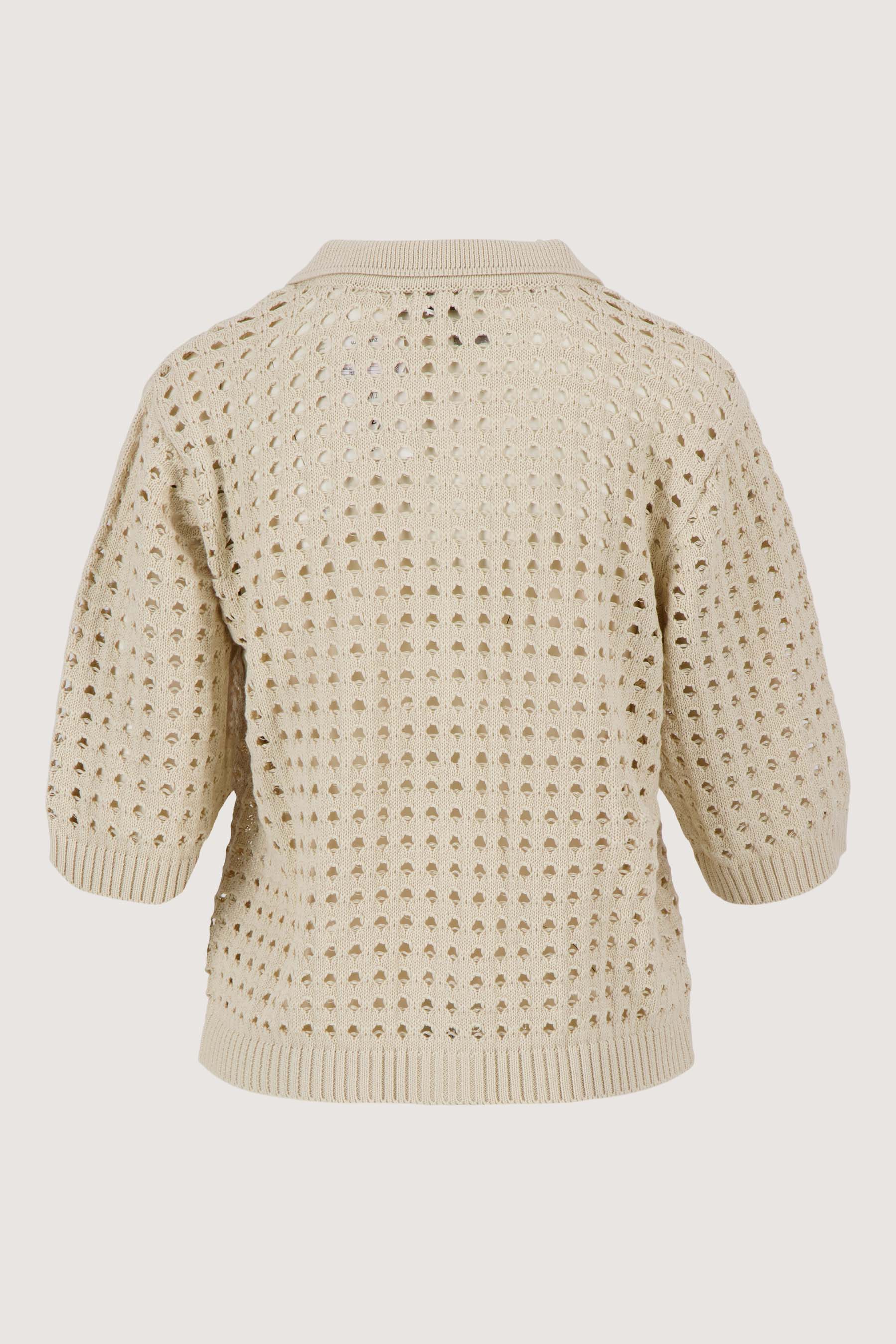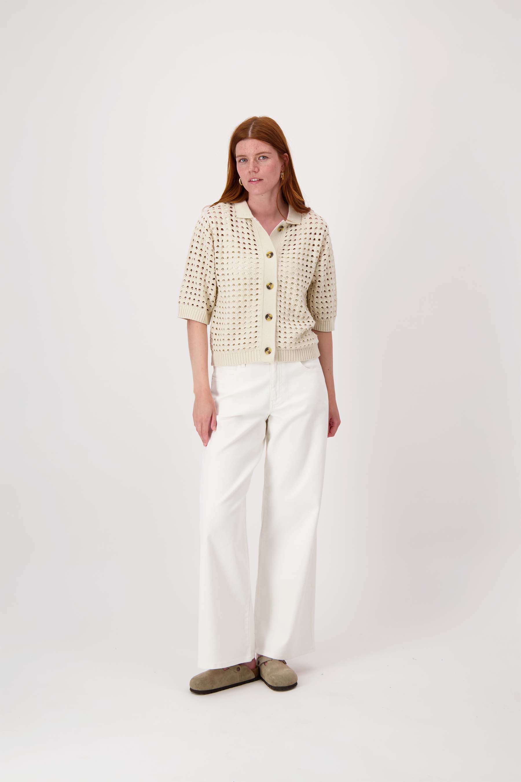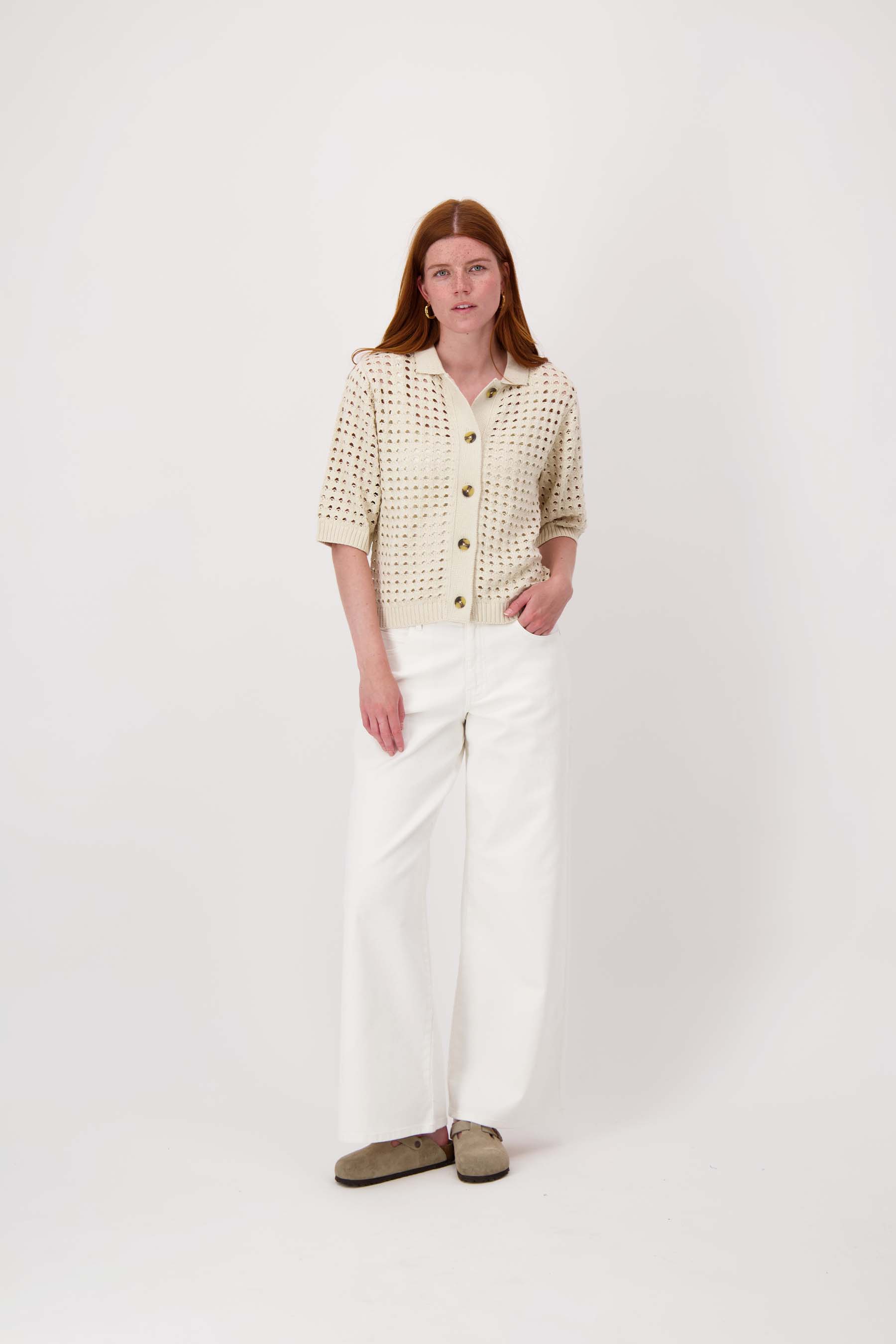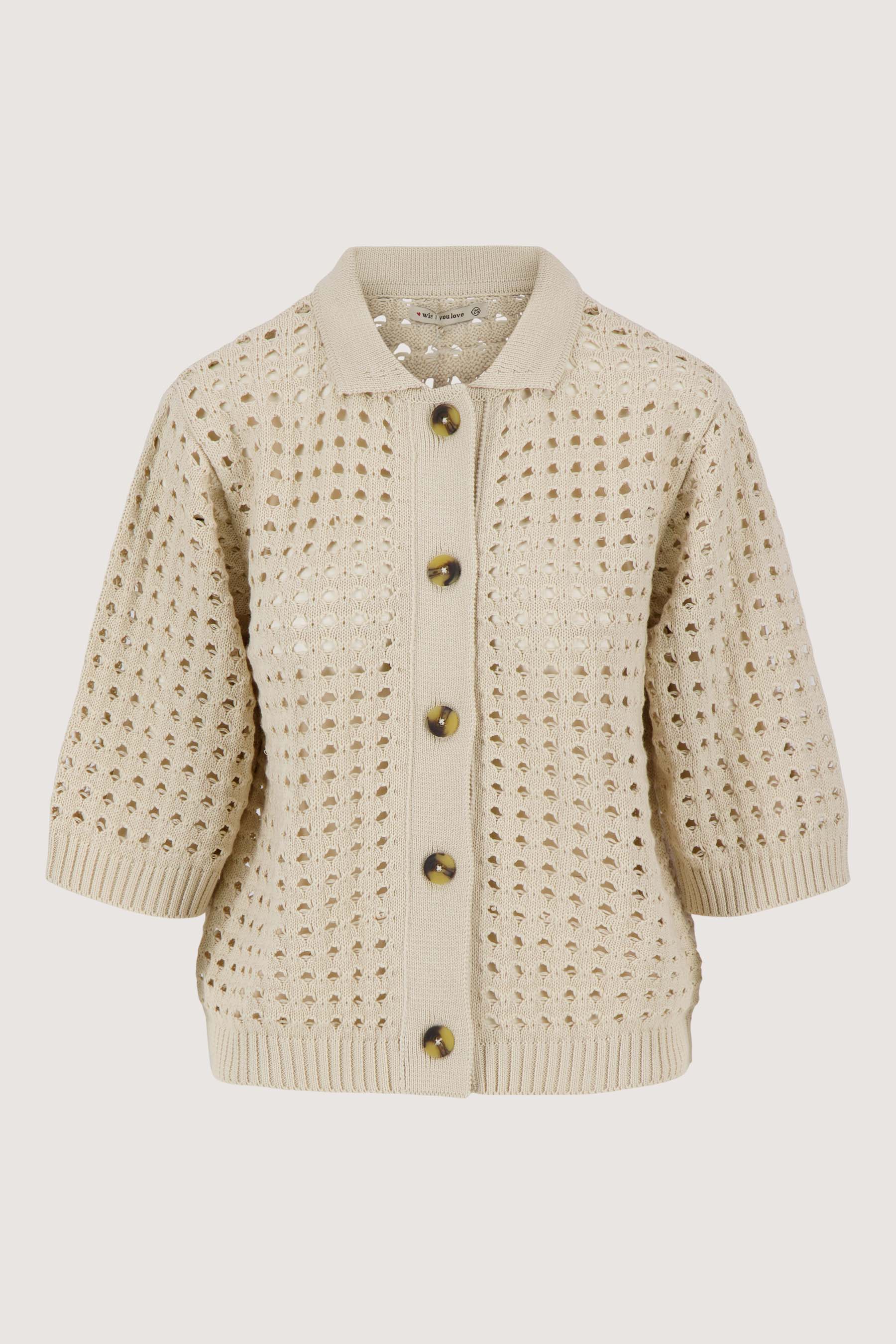Diese Strickjacke mit Polokragen von Zusss ist die perfekte Wahl für alle, die einen sommerlichen Ajour-Look lieben. Die Strickjacke mit Polokragen besticht durch ihr offenes Ajour-Muster und die kurzen Ärmel, die für einen luftigen, lässigen Look sorgen. In einem sanften, cremefarbenen Ton gehalten, bietet diese Strickjacke vielseitige Kombinationsmöglichkeiten für Ihre Garderobe. Der dezente Polokragen und die Knopfleiste machen diese Strickjacke mit Polokragen zu einem modischen Blickfang für jede Jahreszeit. Kombinieren Sie die Strickjacke mit einer unserer weiten Hosen für den perfekten Look.