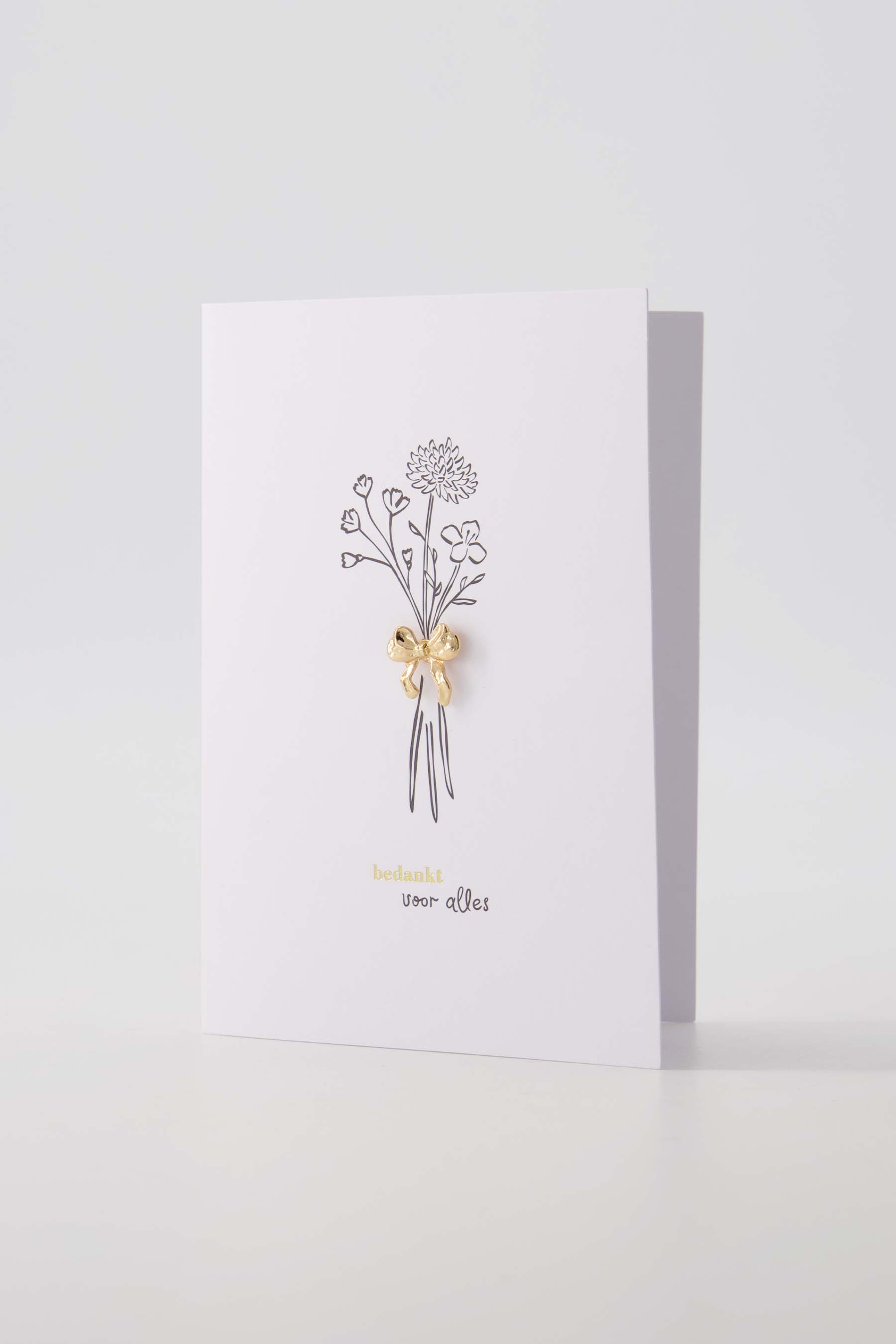Deze Zusss wenskaart is een stijlvolle manier om ‘bedankt’ te zeggen. Met een fijn lijntje bloemen en een goudkleurige strik als broche erop, krijg je... Lees meer
