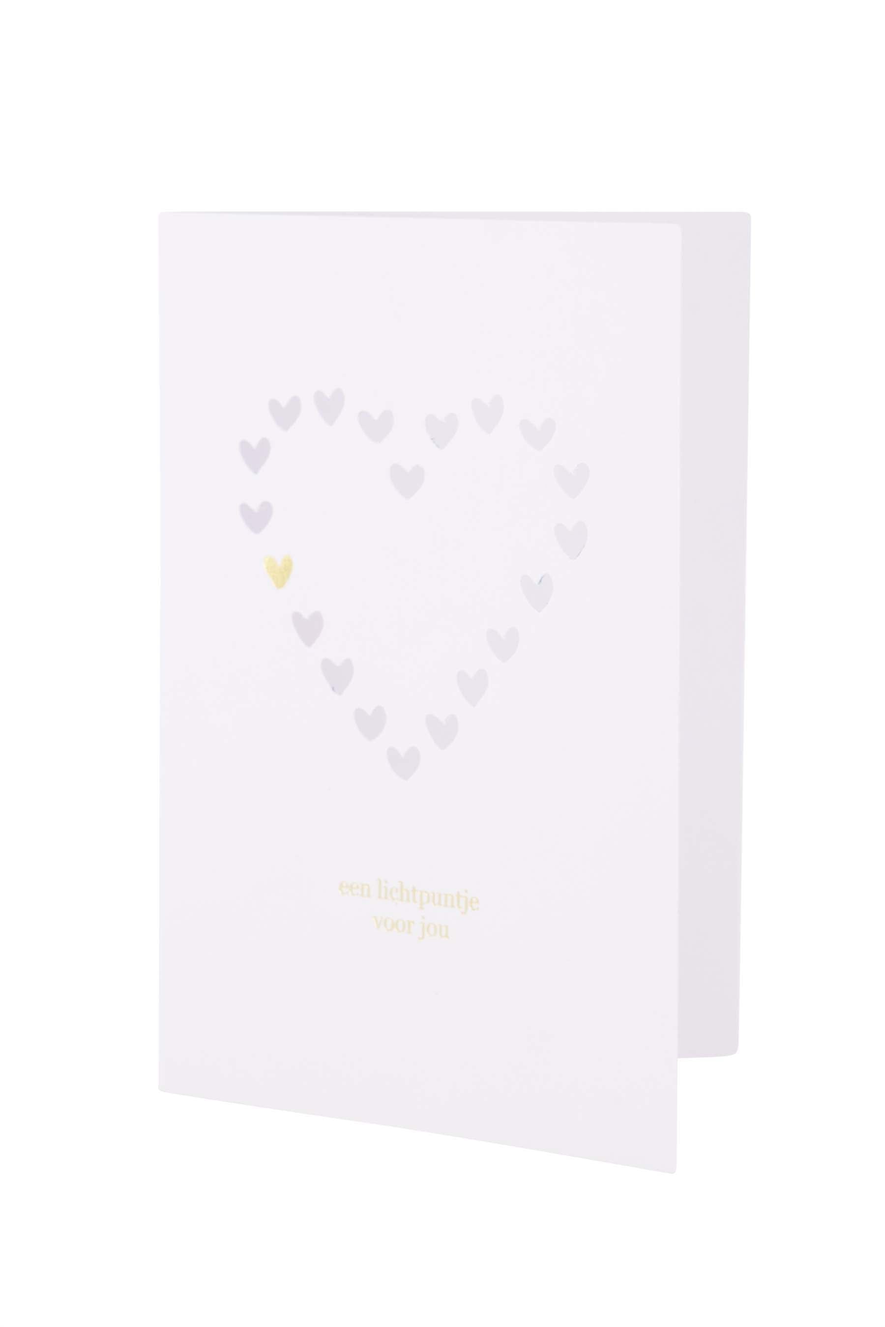 De Zusss wenskaart lichtpuntje is perfect om een warme boodschap te sturen. Deze wenskaart lichtpuntje heeft een lief hartje van kleine illustraties in wit met een subtiel goud detail, gemaakt van hoogwaardig papier. De afmeting van deze kaart maakt hem ideaal om een persoonlijke noot aan toe te voegen. Met de combinatie van wit en goud straalt deze wenskaart lichtpuntje elegantie uit. Bekijk ook onze andere wenskaarten voor nog meer liefdevolle opties.