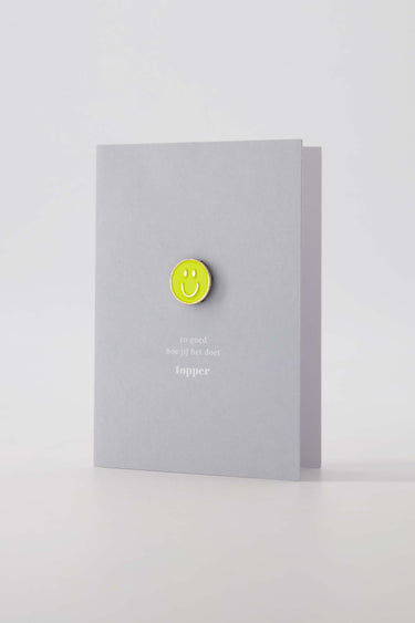 Deze Zusss wenskaart magneet zorgt voor een vrolijke twist bij elke felicitatie. Met de gele smiley in het midden op een rustige grijze achtergrond, breng je eenvoudig een zonnige boodschap over. De wenskaart is perfect om een compliment of een lieve groet mee te geven. De combinatie van geel, grijs en blauw maakt deze wenskaart net even anders dan anders. Zo geef je net dat beetje extra aandacht op een warme, stoere manier.