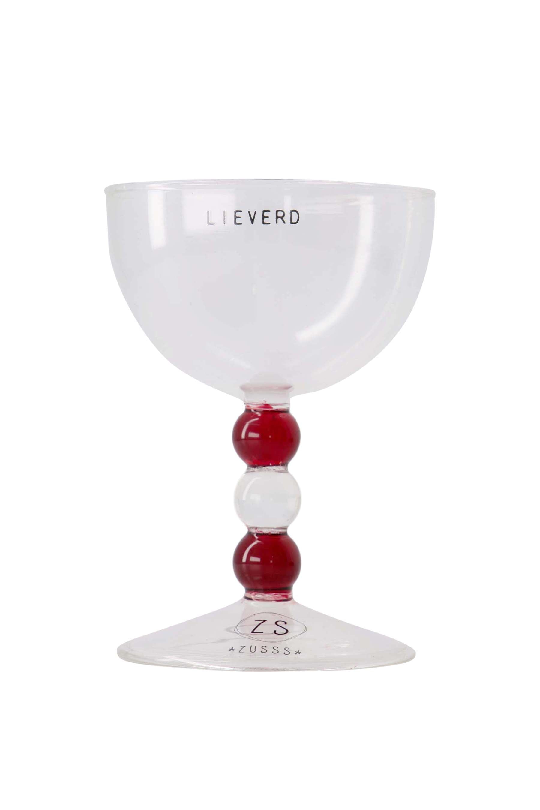 Das Zusss Weinglas Sweetheart ist ein besonderes transparentes Glas, das sofort ins Auge sticht. Die verspielten roten und klaren Kugeln im Stiel geben diesem Weinglas einen einzigartigen Look. Der klare 'LIEVERD' auf dem konvexen Kelch rundet es ab. Perfekt für einen gemütlichen Moment, bringt dieser Weinglas-Liebling Wärme und Individualität auf Ihren Tisch. Die sanften Farben und das feine Finish fügen sich nahtlos in jedes Geschirr ein und machen den Genuss besonders angenehm.